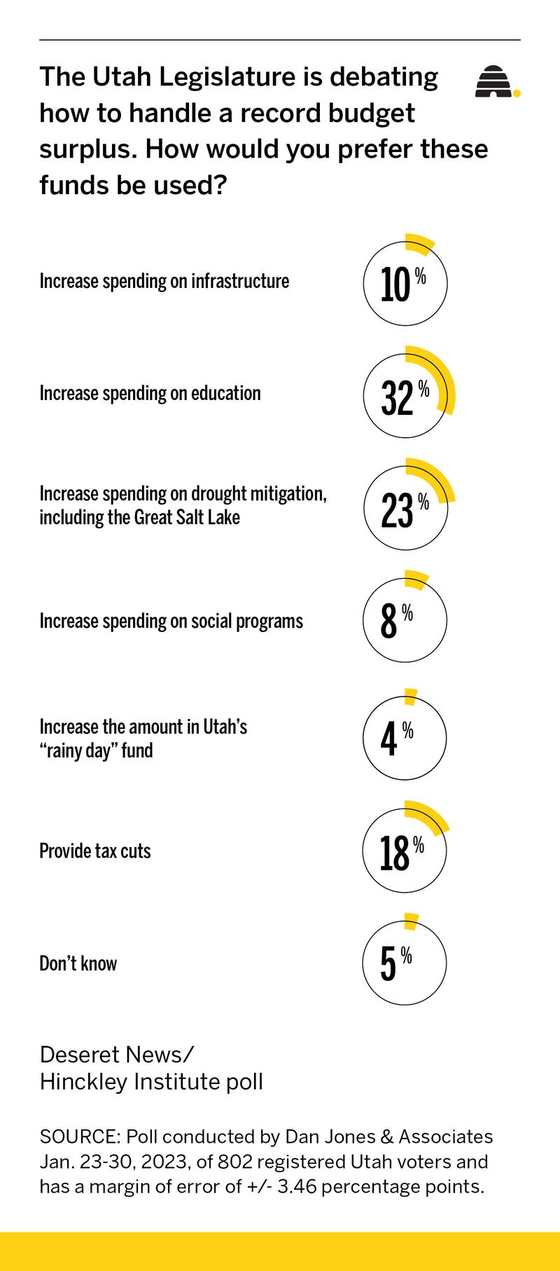 That’s according to a new Deseret News/Hinckley Institute of Politics poll, which asked Utahns how they’d like the Legislature to spend its budget surplus.