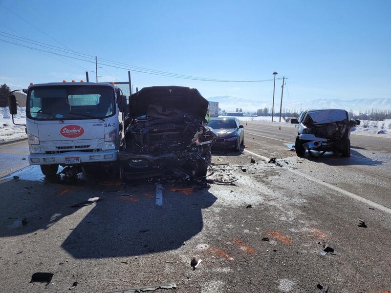 Utah Highway Patrol troopers said the pickup was traveling east when it ran a red light and collided head-on with a Dodge Ram pickup truck stopped in the westbound lanes. The impact pushed the Dodge Ram back into a BMW also stopped at the light, which then got pushed into another truck stopped at the light.