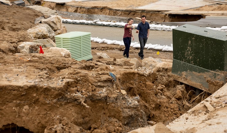 Public works crews, construction workers and volunteers from nearby neighborhoods gathered Wednesday morning to place sandbags along the street, trudging through ankle-deep water and avoiding the major road erosions.