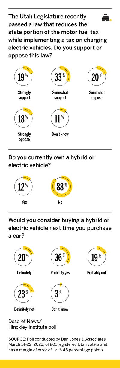 Still, the poll showed that 56% of Utah residents would definitely or probably make an electric vehicle or hybrid their next vehicle purchase, while 42% said it is not something they would consider. Three percent said they did not know.
