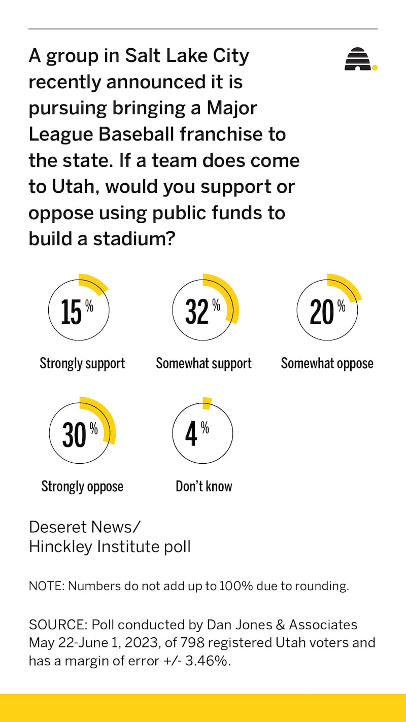 Utahns overwhelmingly support the effort to bring a major league team to the state, according to a Deseret News/Hinckley Institute poll in April that found 81% of residents strongly or somewhat favor the idea.