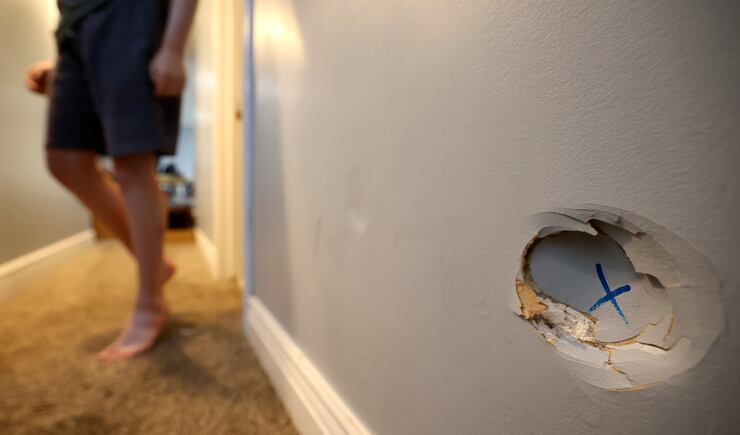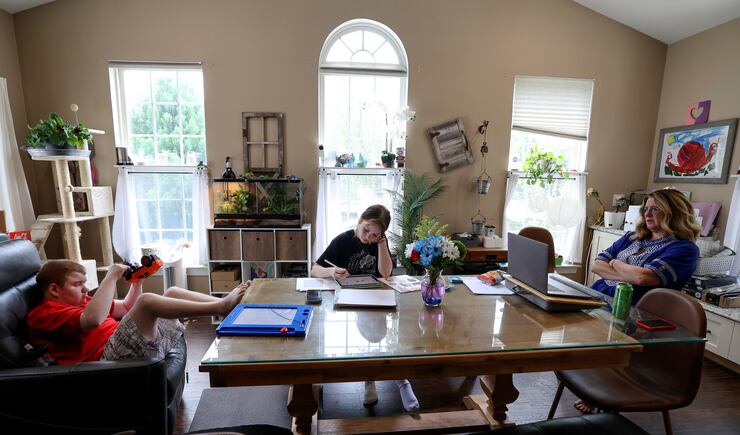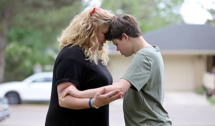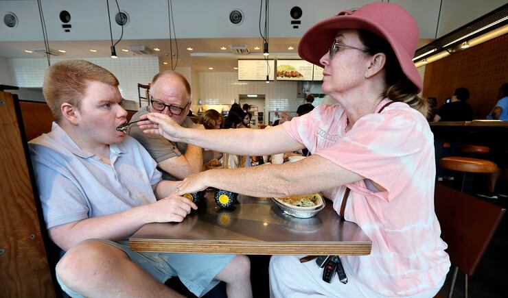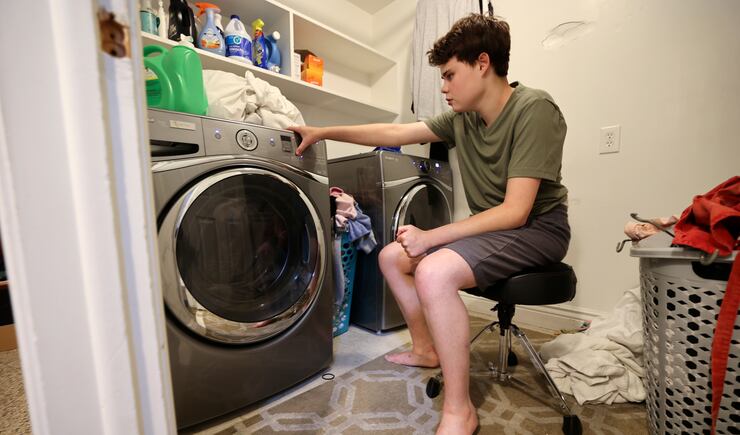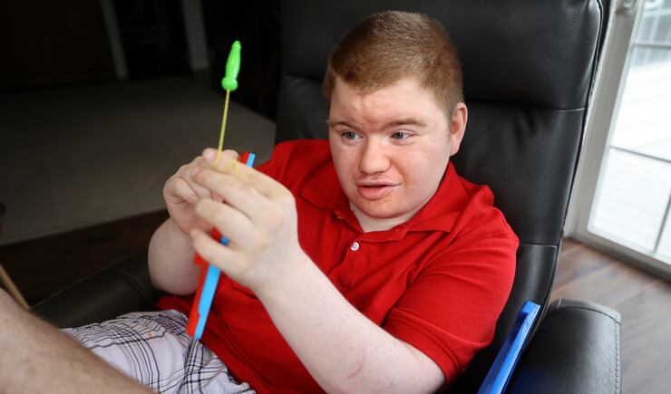 Evidence of his more fitful times can be seen around the house: holes in the wall, dents in the refrigerator, photos and artwork without frames. Nothing gets broken on this day. But he is constantly on the move: plinking on a full-size keyboard, taking a sip of Diet Coke, listening to a musical toy, taking a bite of noodles. He is sweet and unpredictable. He hugs his mom but pinches her arm at the same time. He is a toddler in a teenage body.