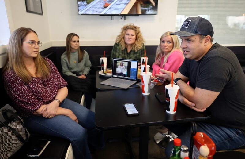 They’ve been here for two hours when I arrive. Drink cups and plates of half-eaten sandwiches and cold french fries stretch across the table. April Sintz, Emilie Campbell, Catrina Nelson and Clint Atwater are seated around the table with May. Annette Maughan appears on a laptop screen from her home in Maryland.