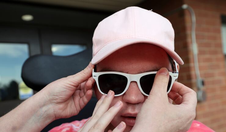 May wheels him outside and down an empty street on the campus. He wears a pink and orange tie-dyed polo shirt, pink ball cap and white sunglasses. She stops at an area covered with rocks. In the center is a raised manhole cover. She puts a basket of rocks on Stockton’s wheelchair tray. A lover of basketball, he slowly tosses them one-by-one, pop-a-shot style onto the steel cover 10 feet away. Rock tings on metal. He rarely misses.