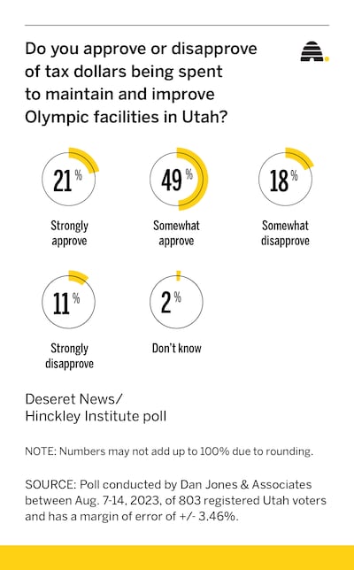 A sizable majority of Utahns support spending tax dollars to maintain and improve the state’s Olympic facilities, according to a new Deseret News/Hinckley Institute of Politics poll.
