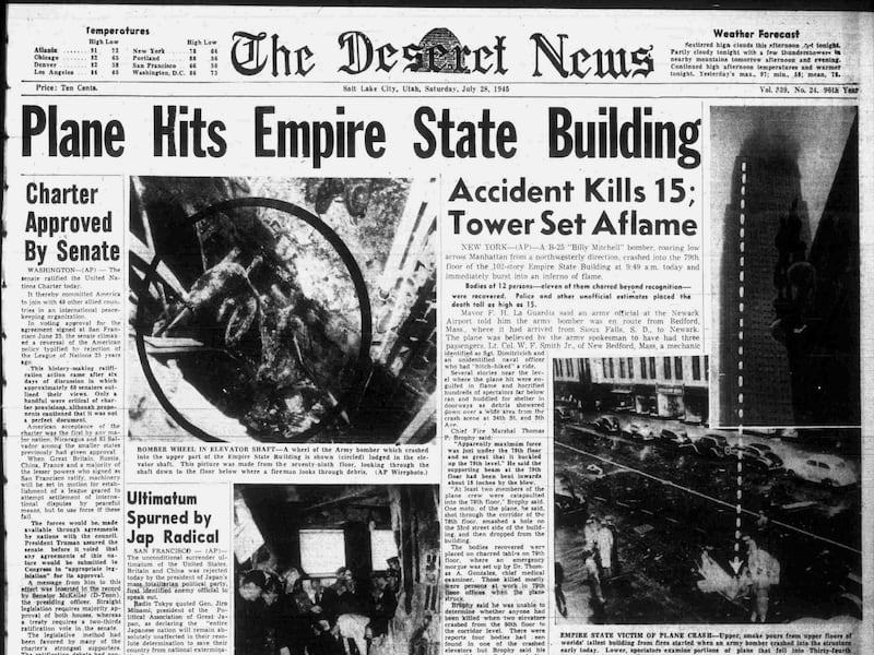“A B-25 ‘Billy Mitchell’ bomber, roaring low across Manhattan from a northwesterly direction, crashed into the 79th floor of the 102-story Empire State Building at 9:49 a.m. today, and immediately burst into an inferno of flame,” read the top story of Utah’s newspaper.