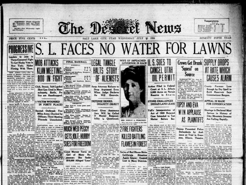 “Salt Lake confronts the most serious water situation in its history and unless the people of the city save 4,000,000 gallons of water a day it will be necessary to cut off another sprinkler day, and further, if the dry weather continues for another two weeks it may be possible no lawn sprinkling will be permitted,” the water works director told Mayor C. Clarence Nealen on July 30, 1924.
