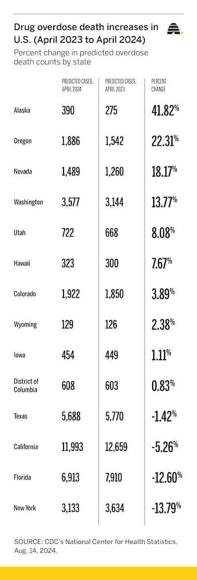 Megan Broekemeier, drug overdose prevention research coordinator for the Utah Department of Health and Human Services, told the Deseret News over email that preliminary data from the Utah Office of the Medical Examiner shows a 16.7% increase in drug overdose deaths from April 1, 2023, to March 31, 2024, compared to April 1, 2022, to March 2023.