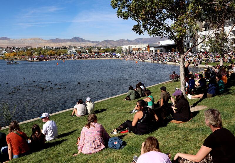 Boaters squeezed themselves into giant pumpkins, to the amusement of hundreds, while competing for bragging rights at the 13th-annual regatta on Daybreak’s Oquirrh Lake in South Jordan on Saturday.