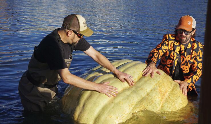 "It's a lot of work through the year just kind of babysitting them, adding different amendments to the soil and the plant," he said. At around 90% water, the plants are always thirsty during growing season. The biggest pumpkin Nash has ever grown weighed in at 1,478 pounds. They are all so massive, they have to be hoisted onto flatbeds for transport.