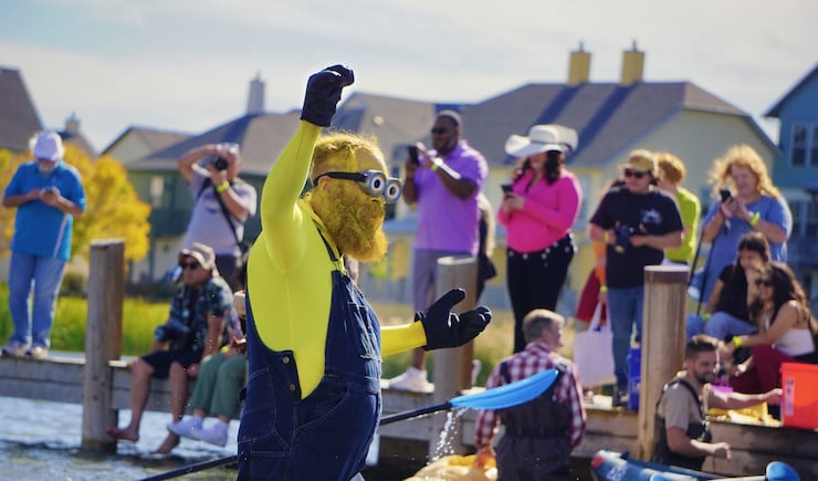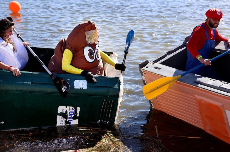 Nash changed costumes, wearing an inflatable poop emoji suit, before dancing his way into a horizontal plastic outhouse. They sailed surprisingly well, despite some precarious rocking from top-heaviness. The giant pumpkin grower and his rowing partner Lindsay Bench, dressed as a roll of toilet paper, finished a respectable third out of four potties, followed by the Mario Brothers.