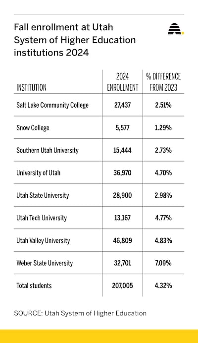 Utah Valley University, meanwhile, continues to be the most popular destination for college-bound Utahns. A record number of 46,809 students are enrolled for the 2024 fall semester — an almost 5% jump from the fall of 2023.