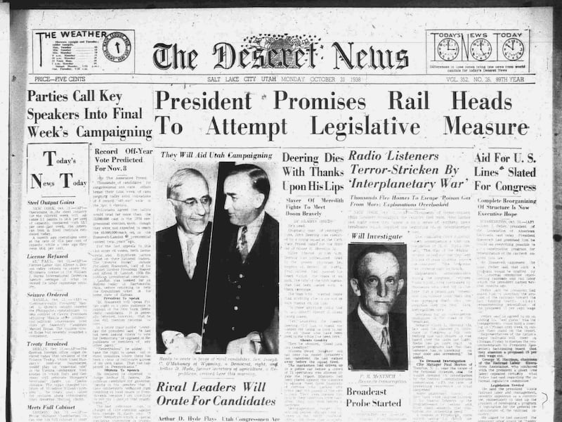 “Radio listeners panic-stricken by ‘interplanetary war,’” read the front page of the Deseret News on Monday, Oct. 31, after the performance. Here are some stories from Deseret News archives on “War of the Worlds.”