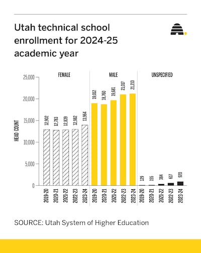 There is one area of higher education in Utah where male enrollments outpace females, as reflected by last year’s 2023-2024 academic year: technical colleges.