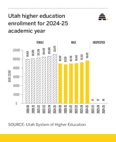 Of the approximately 207,000 students enrolled in the Beehive State’s degree-granting institutions for the 2024-2025 academic year, 53% were female, according to headcount statistics posted by the Utah System of Higher Education.