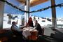 The hostess encourages us to remove our ski boots and put on slippers from the tidy stack they have in the waiting area. Then she escorts us to our table in the corner that overlooks a mountainscape punctuated by a cloudless blue sky.