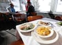 We start with salted bread and hummus while our waiter explains the menu, which is presented on a chalkboard that the waitstaff moves from table to table. The food is seasonally and locally sourced, Huskinson explains, so the menu can change daily. We order the jalapeño poppers, Maine scallops and butternut latkes to share, and I order the arugula poached egg salad with Utah trout.