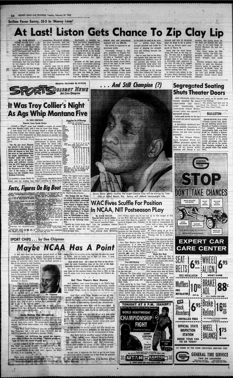 On the day of the fight, front page headlines were somber and typical in the Deseret News. A jet liner had crashed near New Orleans with all onboard feared dead. The U.S. House of Representatives had passed a big tax cut, the U.S. was dealing with problems in Russia and Cuba, and Jimmy Hoffa — yes, that Jimmy Hoffa — testified about price fixing in a Tennessee courtroom.