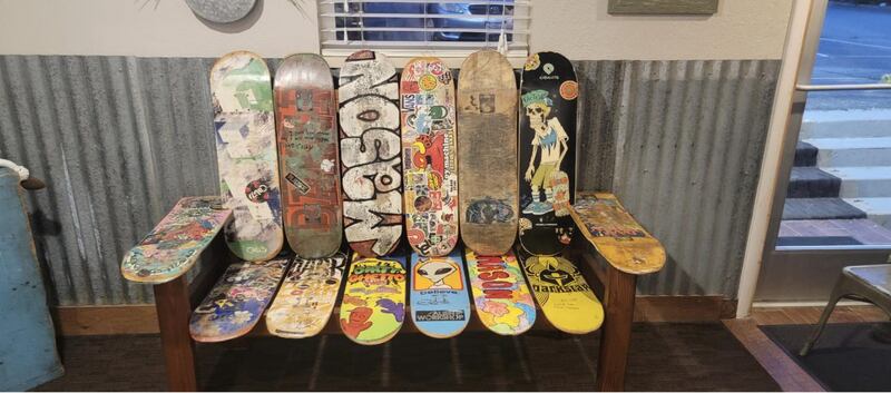 A little over a year later, the family decided to memorialize their son with a bench made out of skateboards, because Mason loved skateboarding. They wanted to place one at the Rusted Spoon since Mason had worked there.
