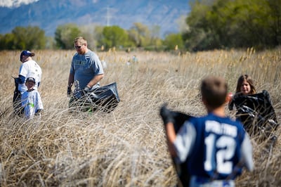 People pick up trash on the beaches of Utah Lake as part of an Earth Day celebration in Vineyard on Saturday, April 22, 2017. Around 200 people came out to participate in the cleanup. | Nicole Boliaux, Deseret News