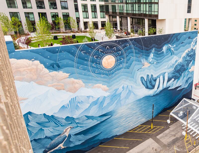 All the building’s changes unintentionally led to a massive, eight-story wall that felt very blank as residents started moving in. Kensington explored the idea of turning its western wall into a giant projector screen, but it ultimately settled on a partnership with the Salt Lake City Arts Council on a plan to fill about 13,000 square feet of space with paint.