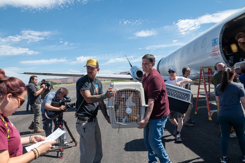 Dozens of dogs and cats from shelters in central Texas were flown to Utah to be taken to Best Friends Animal Society’s Sanctuary in Kanab on Wednesday.