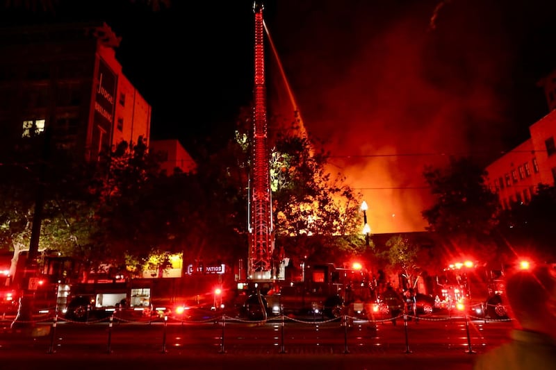“We’ve taken a defensive posture. ... There was some structural collapse within the building, so that’s why we initially decided to pull crews off the roof, as well as the interior of the building,” Silverthorne said, while crews continued to battle the fire a half-block away. “That’s when we initially started transitioning from an offensive strategy to a defensive strategy.