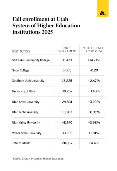Enrollment across Utah’s public higher education institutions has risen once again with fall 2025 enrollment reaching 216,116 students across the state’s eight degree-giving institutions.