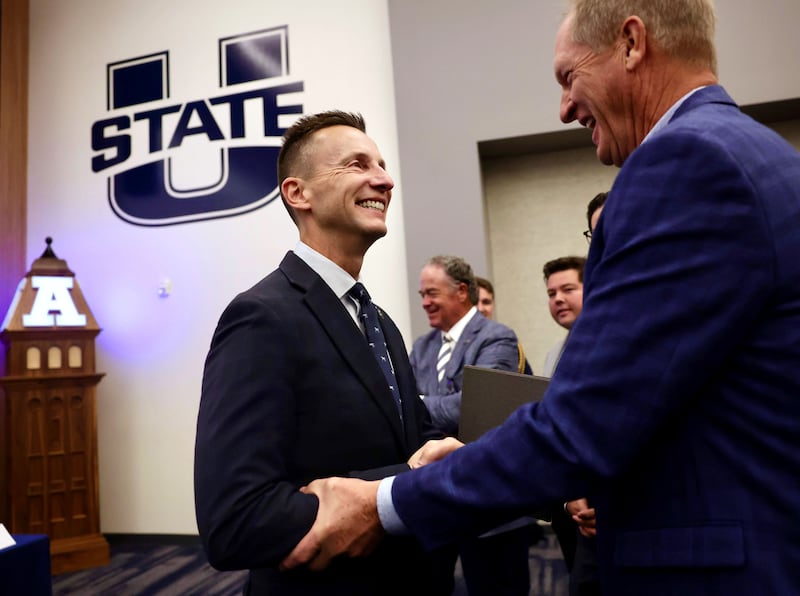 In front of a packed hall gathered for Thursday’s announcement on the USU campus, Mortensen marveled that a first-generation college graduate and a proud Aggie alum would be returning to Logan to lead his alma mater.