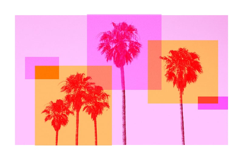 The “LA in full bloom” color palette — sagebrush, poppy, scarlet flax and bluebell — all come from a common sight along city streets, the official flower of Los Angeles, the tropical Bird of Paradise native to South Africa.