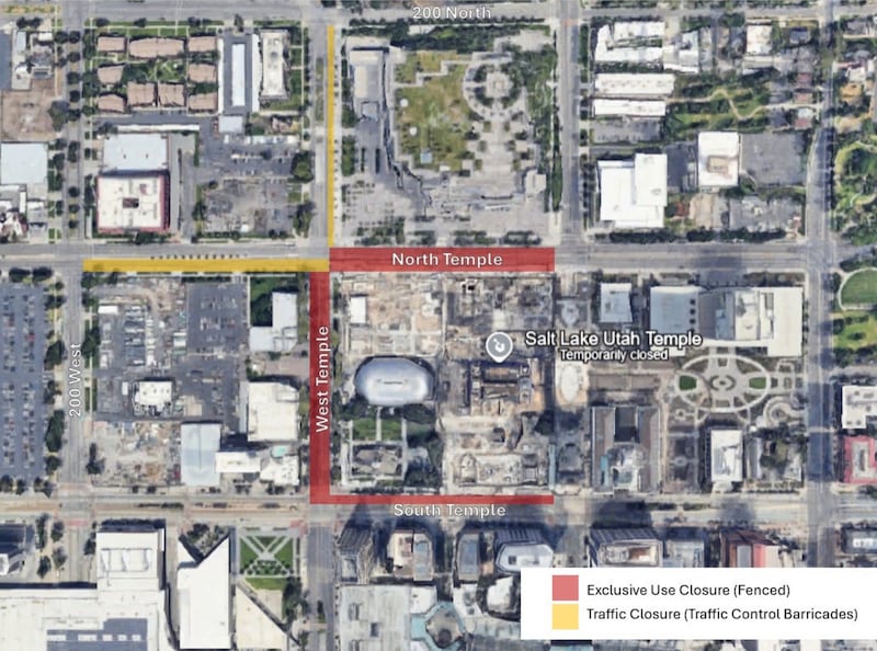 The closures, authorized to exist between March and October next year, apply to the blocks of North Temple, South Temple and West Temple that are adjacent to the Salt Lake Temple located at the center of the county’s grid system, according to the measure that passed unanimously during a Salt Lake City Council meeting.