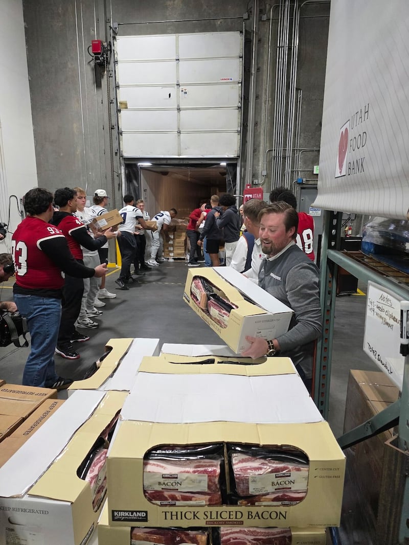 On Friday, a handful of BYU, SUU and Utah State football players worked together to unload 20,000 pounds of pork at the Utah Food Bank.