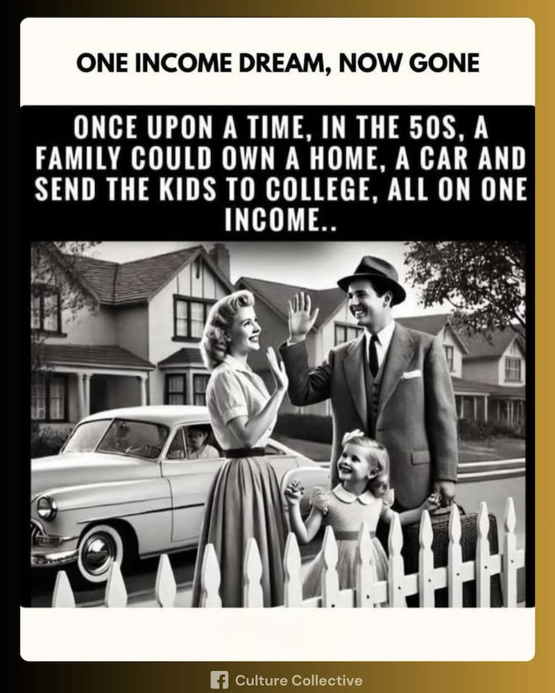 The article mentions a meme about how the notion of a family living on one income is gone in today’s world.